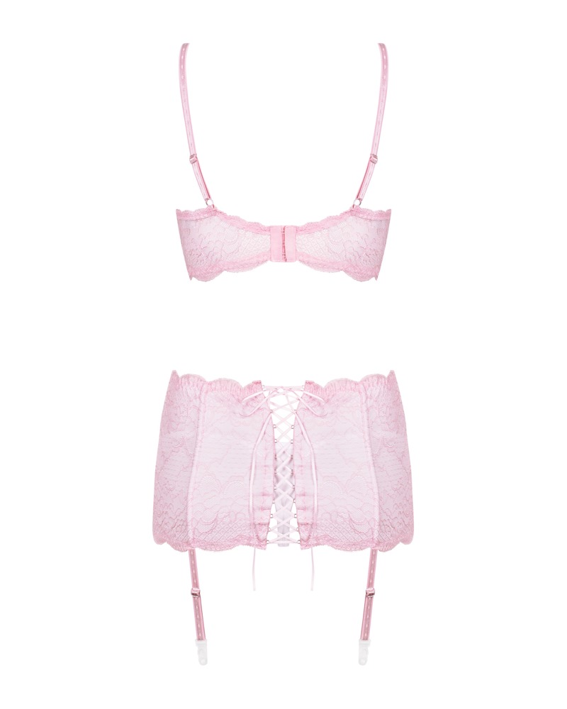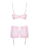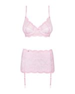 Bygel-BH, höfthållare och string i settet Girlly från Obsessive. Mjukt, vitt stretchmaterial med roséfärgad elastisk spets. Lätt polstrad bygel-BH med justerbar hakknäppning baktill. Axelbanden kan justeras, likaså strumphållarna. Den breda höfthållaren har en variabel snörning baktill.