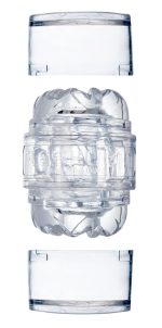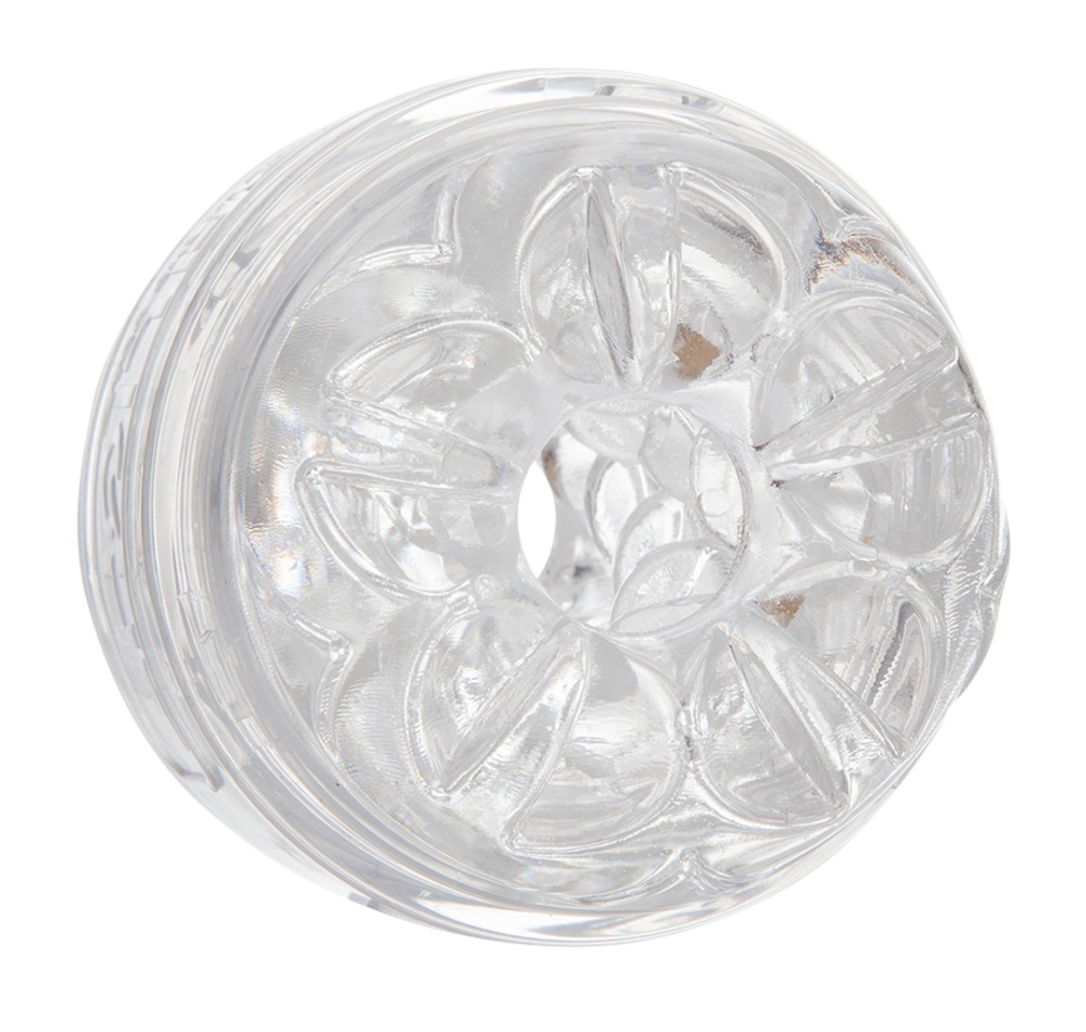 Genomskinlig masturbator av superskin-material med strukturerat inre. Öppen i båda sidor. Bara hälften så stor som andra Fleshlight-masturbatorer: 8,8 cm lång, Ø 1,8 cm, elastisk. Material: sammansättning av polymeren och mineraloljor. Inklusive en genomskinlig förvaringsbox.