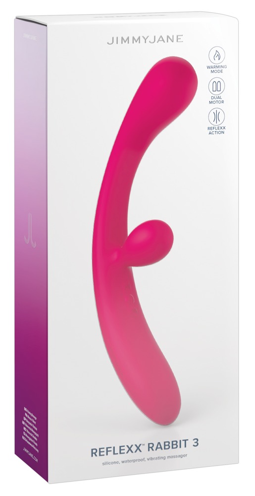 Snyggt designade vibratorn Reflexx Rabbit 3 från JimmyJane för en dual stimulation av vagina/G-punkt och klitoris. Vibratorn är perfekt böjd och flexibel och anpassar sig perfekt till kroppen och kroppens rörelser. De kraftfulla vibrationerna känns både invändigt och på utsidan.