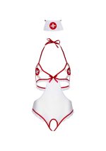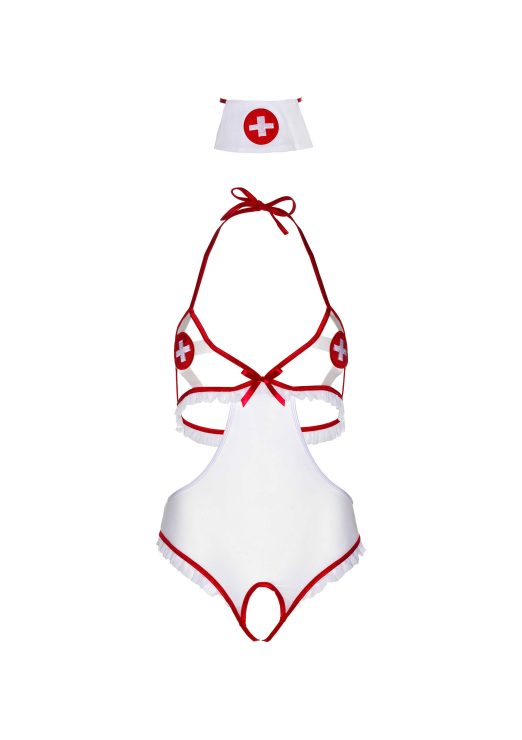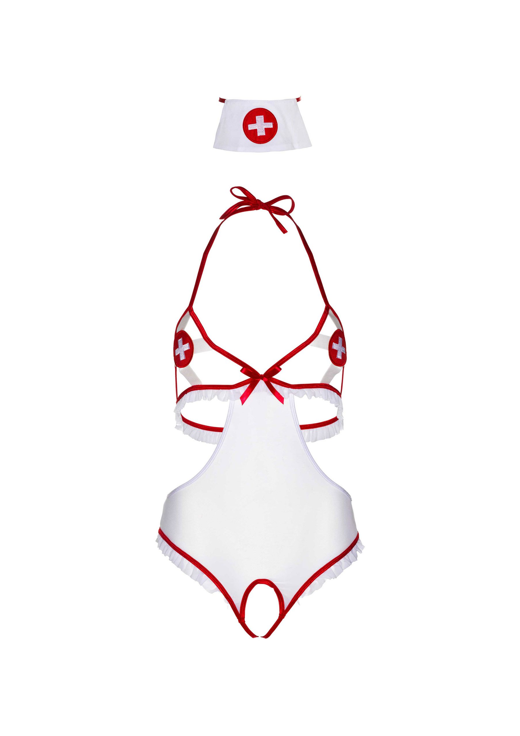 2 PC. Naughty Nurse includes a crotchless teddy with open cups and a matching hat headband.
