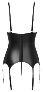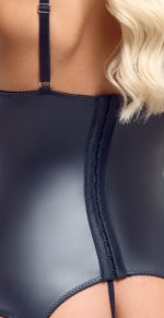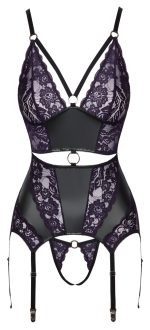 Strumphållartop och öppen string i ett set från Cottelli LINGERIE. I svart mattlook med spetsinsatser framtill i ädelt mörklila. Mjuk och elastisk för maximal komfort. Med snygga stretchremmar och ring mellan de mjuka spetskuporna. Axelbanden och de totalt 6 strumphållarna kan justeras. Likaså den dubbla hakknäppningen i ryggen. Den lilla stringen är öppen i grenen.