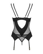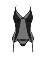 Strumphållartop och string i det svarta settet Nesari från Obsessive. Mjukt, elastiskt nät i en snygg mix med ogenomskinligt stretchmaterial. Liten smyckesdetalj mellan bygelkuporna. Justerbar hakknäppning i den djupa ryggskärningen. De kryssade dubbla axelbanden och strumphållarna kan också justeras. Nätstringen är ogenomskinlig i grenen.
