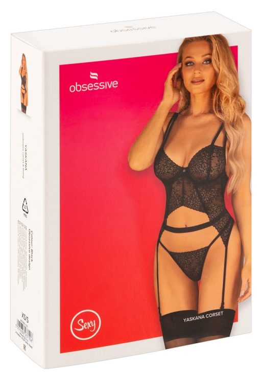 Strumphållartop och string i settet Yaskana från Obsessive av fin spets. Mjuk och elastisk för maximal komfort. I en läcker magfri skärning med midjeband. Kupor med bygel för perfekt stöd och passform. Variabel snörning baktill. Axelbanden och strumphållarna kan justeras. Den enkla spetsstringen fulländar denna sexiga look.