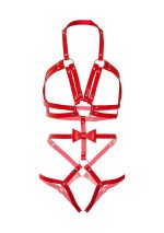 Convertible harness teddy in vegan leather with O-ring studs, a snap-off panty, adjustable straps and cute bow detail.