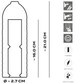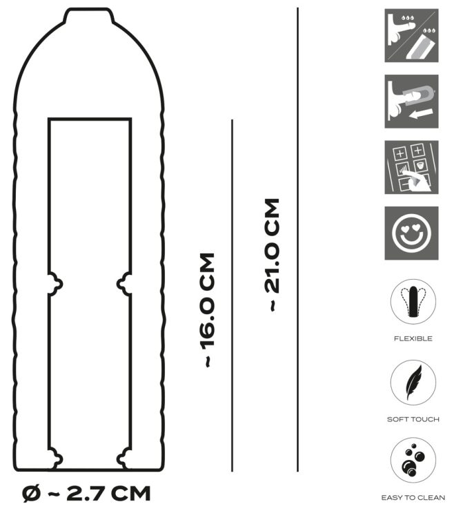 Total length 21 cm, insertion depth 16 cm, opening Ø 2.7 cm (flexible).