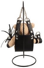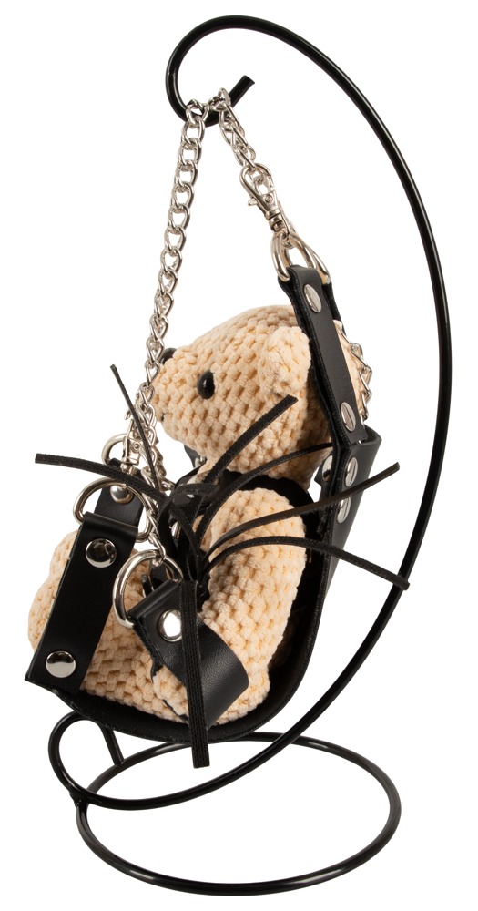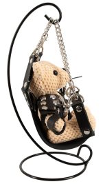 This small, tame SM Teddy with Swing from Bad Kitty is in a crocheted look and is very soft to the touch as well. It is in a typical SM look with a harness, restraints and mini flogger, which are all made out of black imitation leather. There is a keyring chain on its head. The small realistic seat is simply hooked into the mini sex swing’s metal frame – then Teddy can take a seat…