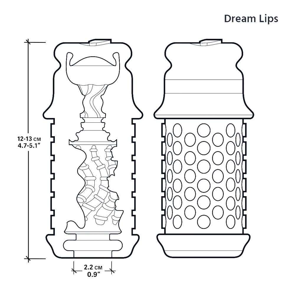 Dream Sleeve Lips: 12 cm–13 cm long, inner Ø 2.2 cm. TPE. TrueGrip Pro Band: total length 29 cm, width 4.5 cm. Adjustable inner Ø 4 cm–7.5 cm. Velcro, spandex, silicone, imitation leather.