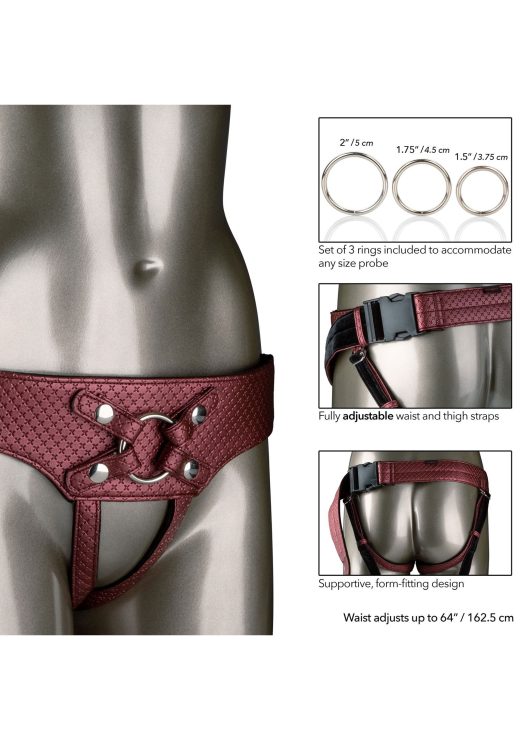 Prepare yourself for indulgent pleasure and premium probe play truly fit for royalty with The Regal Empress.The designer vegan leather, quick-buckle waist enclosure and plushy velvet lining give you the ultimate control over comfort. The snap-in ring system allows 3 different rings to be interchanged to accommodate any size of probe, stimulator or plug. The totally crotchless design lets you surrender yourself to your most erotic fantasies and dive deep into pleasure. This fashion-forward fetish harness adjusts to fit up to a 64” (162.5 cm) waist.