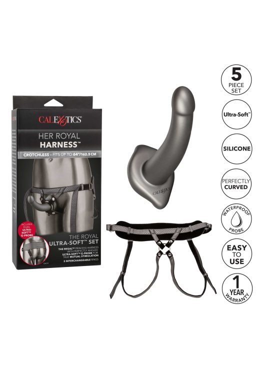 Made to thrust you into the thrilling world of a mutually satisfying pleasure with the Her Royal Harness The Royal Ultra-Soft Set. Each set includes the Regal Princess and the ME2 Ultra-Soft G-Probe with 3 interchangeable probe rings.The sensual Ultra-Soft Probe is made for mutual stimulation and satisfaction with a perfectly contoured base and the g-spot teasing curved shaft. Made to caress yours and hers most intimate curves for double the orgasmic pleasure. The accentuated probe and rigid shaft are created to perfectly tease intimate curves and indulge internal sweet spots for your lover, while you get lost in the teasing contoured base.Stay comfortable while you cozy up to your lover with this femme harnesses soft vegan leather, plush velvet lining and wide lower back support strap. Indulge in designer lingerie with the grey leatherette and nickel-free metal accents. Embrace uninhibited play, unrestrained pleasure and let your fantasies run wild with this harness’ lustful crotch-less design. This delicate harness is compatible with most probes and all ME2 probes.