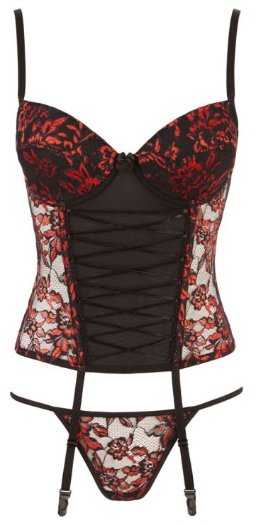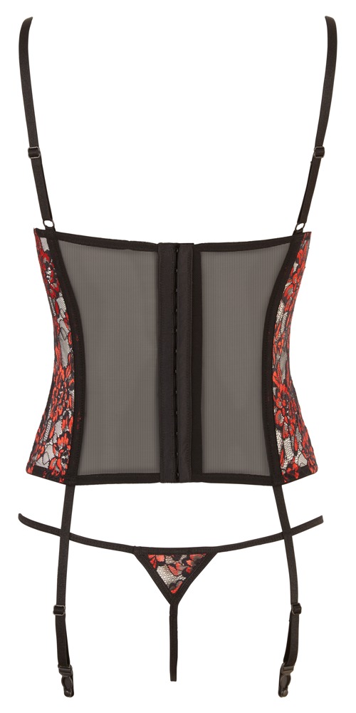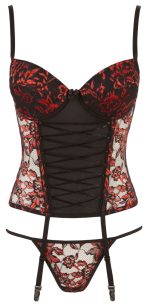 Romantiskt set bestående av corsage och passande string. Snyggt i minsta detalj med pyntsnörning framtil. Av powernet och spets. Med figurformande stavar. Utan strumpor.