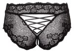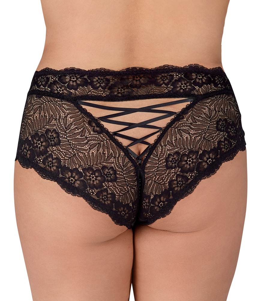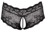 Svart öppen trosa från Cottelli CURVES helt av fin blomsterspets. Mjuk och elastisk för en perfekt passform. Med en elastisk, stimulerande pärlkedja i den öppna grenen och satinbandssnörning baktill.