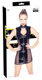 Kort, ärmlös klänning från Black Level helt i en svart lackglans med elastiska nätinsatser på sidorna. I en figurnära skärning med halsband som ståkrage och fin urringning under. Framtill med genomgående dragkedja och 3 spännen.
