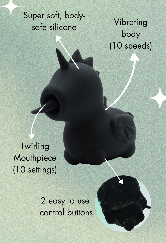 Gulliga klitorisvibratorn Wild Spirit från Unihorn i form av en liten enhörning. Den mjuka, smidiga silikonleksaken ger intensiv njutning med vibrationer och den långa, mjukt virvlande tungan i den öppna munnen. Den dubbla deluxe-motorn ger pålitlig kraft. De 10 olika modusen på vibrationen och tungrörelserna kan styras separat med en knapptryckning. En magisk sexleksak för mångsidiga lekar – ensam eller tillsammans med partnern – hemma eller på resan!