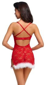 The tight-fitting chemise, X-Mas from Cottelli LINGERIE, is made out of delicate red lace. It is soft and stretchy for a very comfortable fit. Delicate white feathers decorate the wireless cups and hem. There is a slit at either side of the chemise for better movement. The bra straps are in a criss-cross design at the back. The bra straps and the strap at the back with a hook fastener can be adjusted to fit.